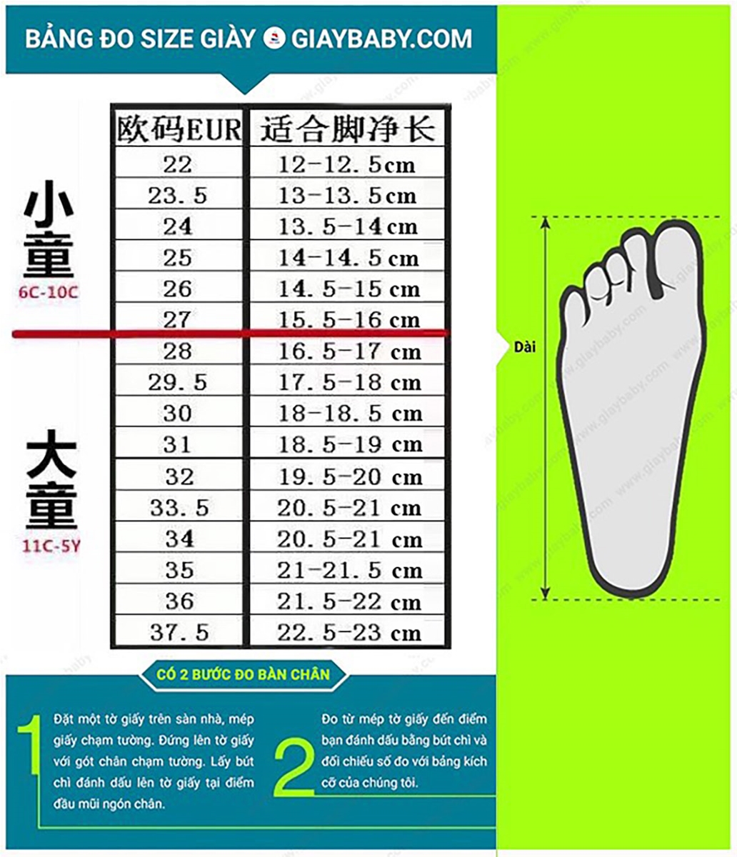 Chiều dài chân trẻ cộng thêm 1cm -1.5cm là ra số đo chiều dài lòng giày phù hợp với chân trẻ. Tiếp theo, bạn chỉ việc so sánh với bảng chi tiết size giày mà shop đưa ra. Từ đó, xác định được size giày chỉnh xác cho bé rồi.